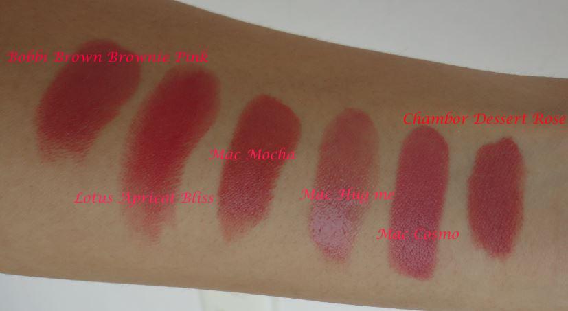 Left to right:- Chambor Powder matte in Dessert rose (Review HERE), Mac Cosmo (Review HERE), Mac Hug me (Review HERE), Mac Mocha (Review HERE), Lotus Herbals Apricot Bliss (Review HERE), Bobbi Brown Brownie Pink