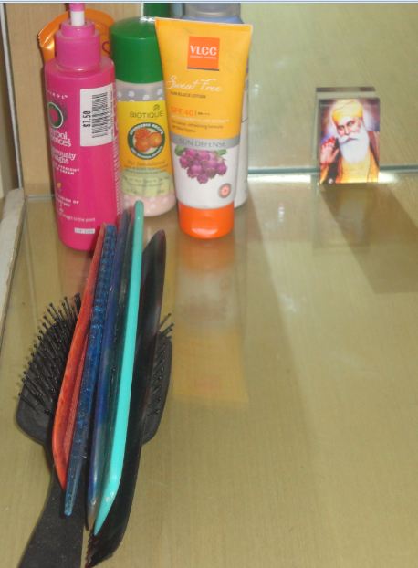 My hair brush, combs, sunscreens and Babaji’s picture 🙂