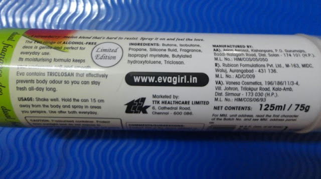 A while ago one of my friends asked me to review some more deos and perfumes. So today I thought I would review one of my most used deodorants. Eva deos are inexpensive and easily available and I have always liked their deos. I had reviewed one in Choco-Vanilla a while ago and I thought I would review another from their limited edition range that I love.