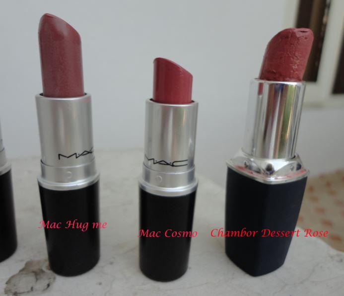 Left to right:- Chambor Powder matte in Dessert rose (Review HERE), Mac Cosmo (Review HERE), Mac Hug me (Review HERE), Mac Mocha (Review HERE), Lotus Herbals Apricot Bliss (Review HERE), Bobbi Brown Brownie Pink