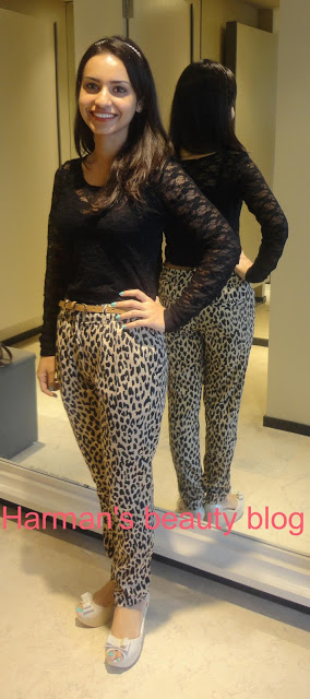 We got to do a little bit shopping. I got myself a shirt from Mango and some makeup stuff from Inglot and Mac :-D. I will post the pictures of that up soon. Here, you can see my outfit. I wore my animal print pants with a black lace top and nude wedges ( which I totally love). Hope all of you liked the look. Let me know 🙂